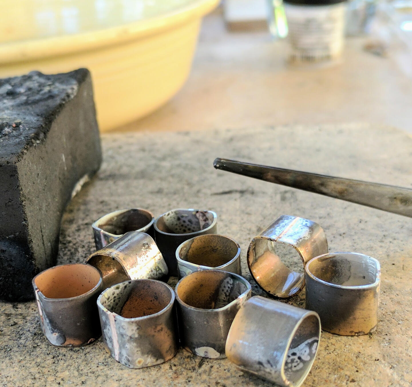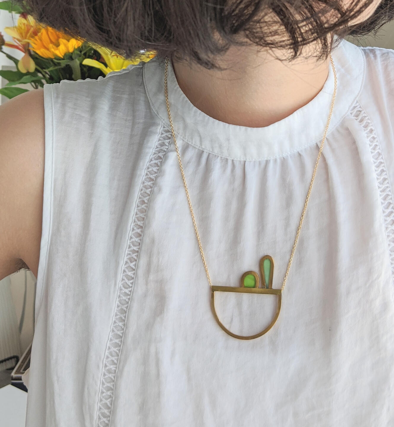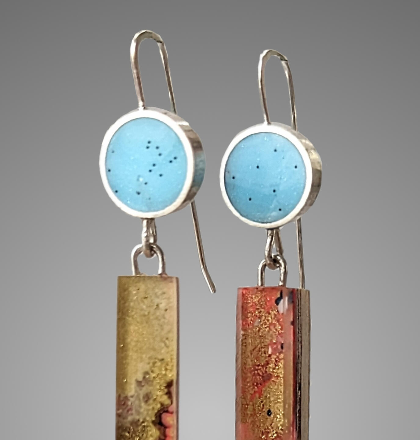 My modern jewelry is handmade in small batches by soldering, hammering, and polishing metal strip and wire. Eco-friendly resin is poured into layers and painted in between with acrylic paint. This acts as a binder for reclaimed wood, crushed stones, textile threads, and various natural pigments.