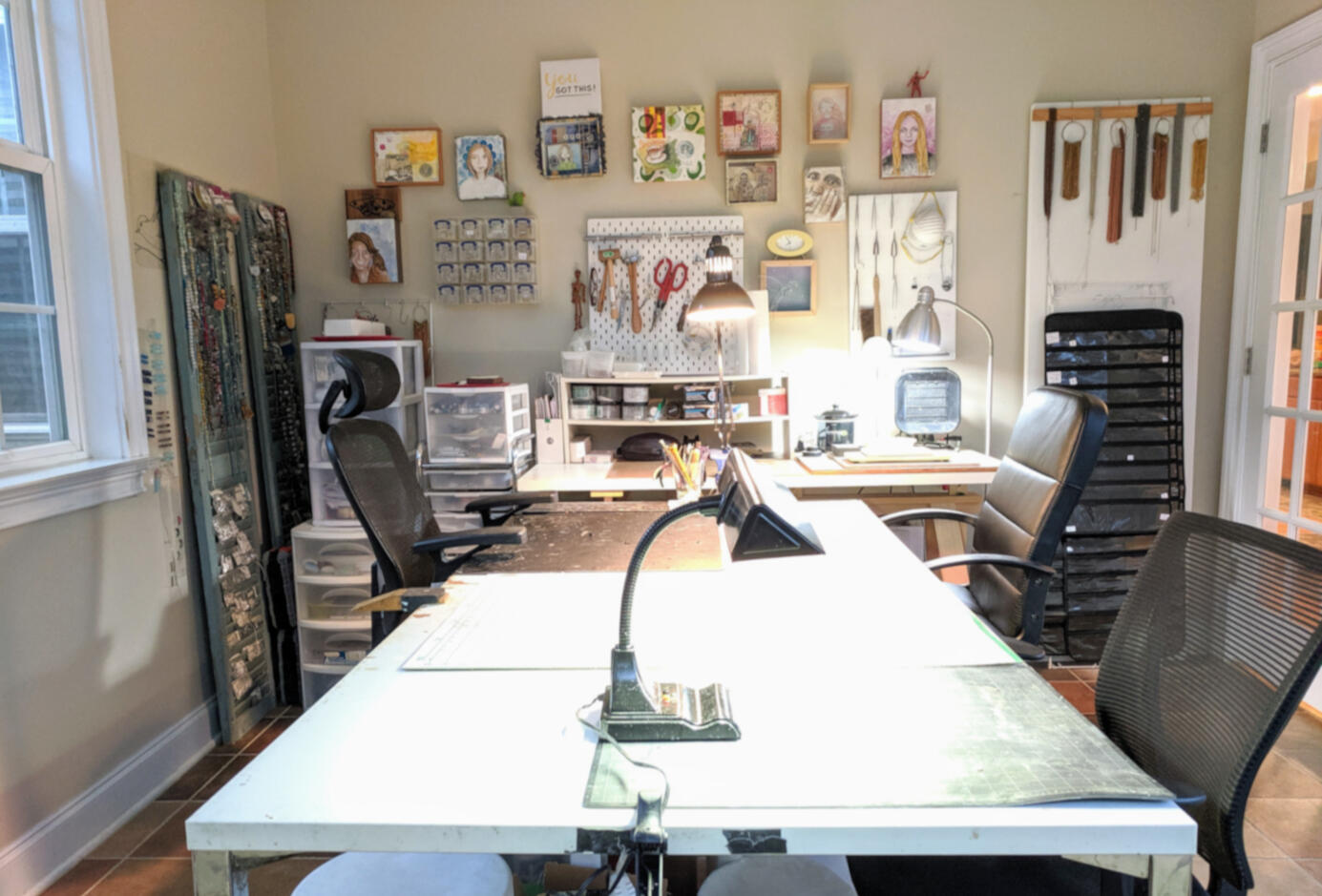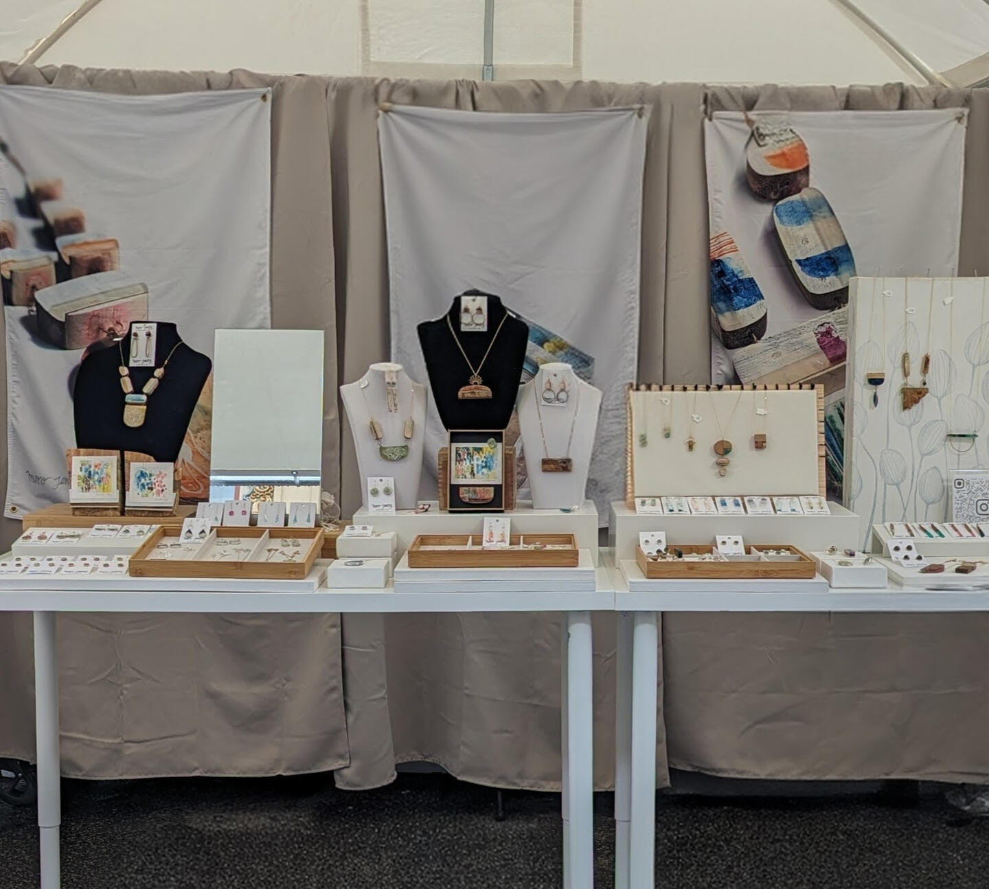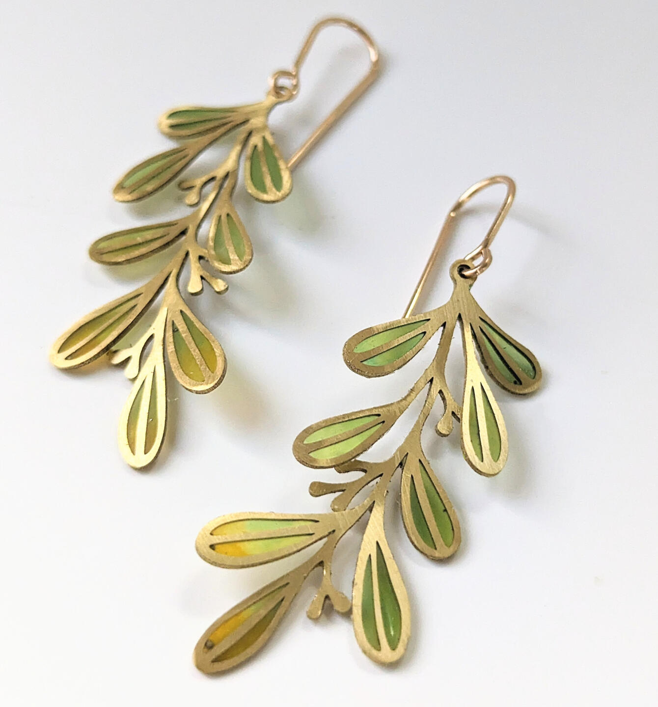 My modern jewelry is handmade in small batches by soldering, hammering, and polishing metal strip and wire. Eco-friendly resin is poured into layers and painted in between with acrylic paint. This acts as a binder for reclaimed wood, crushed stones, textile threads, and various natural pigments.