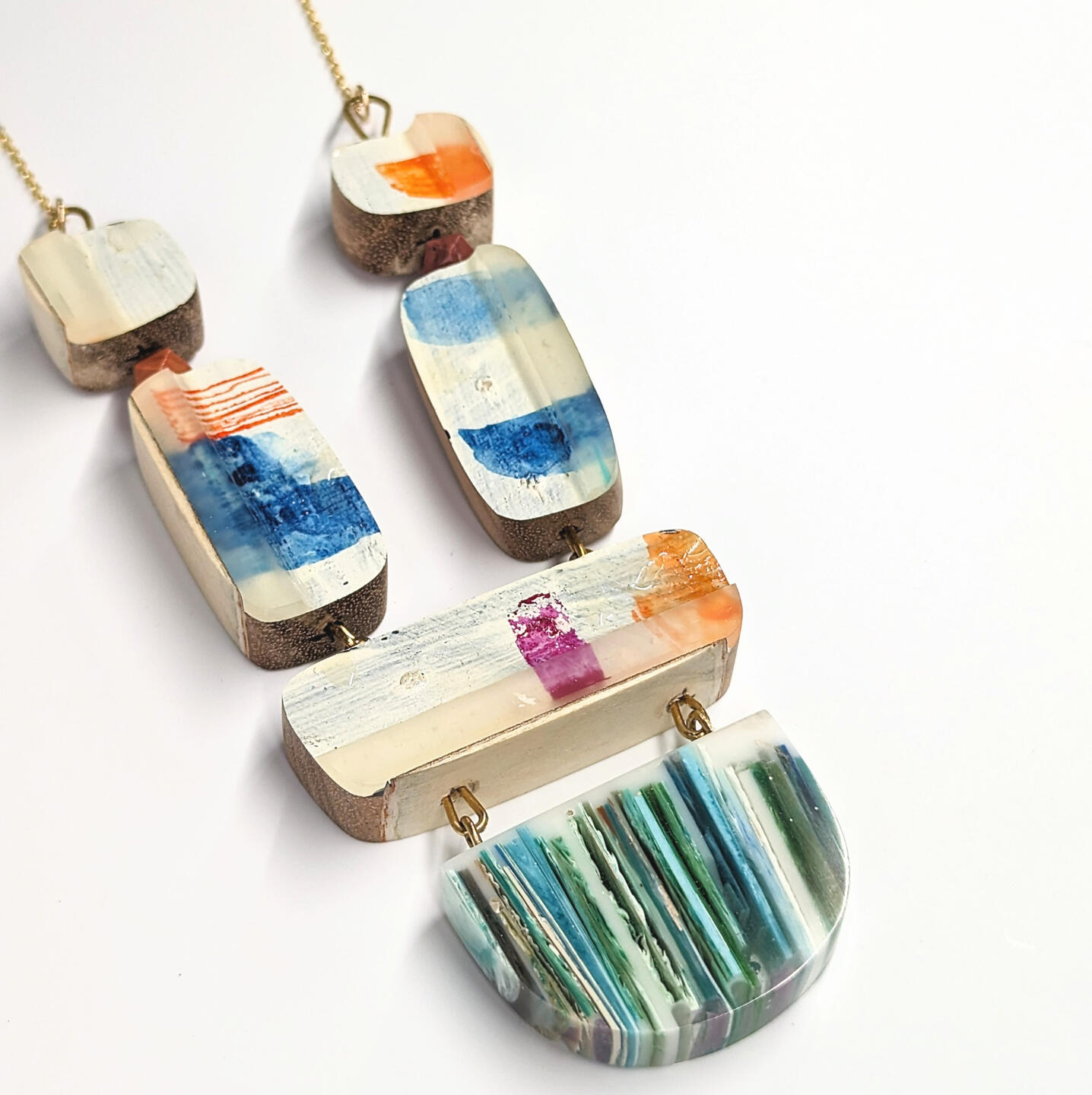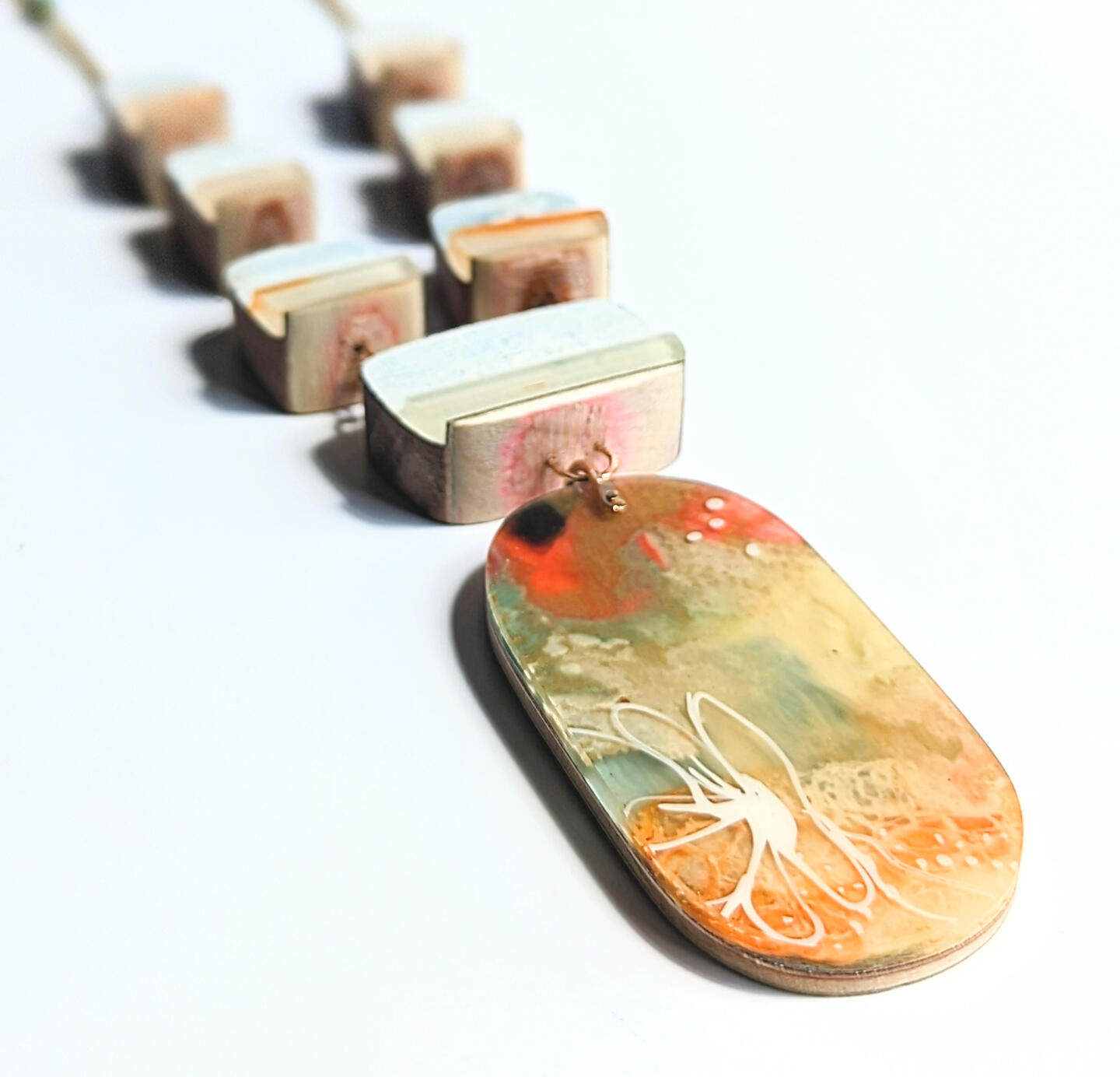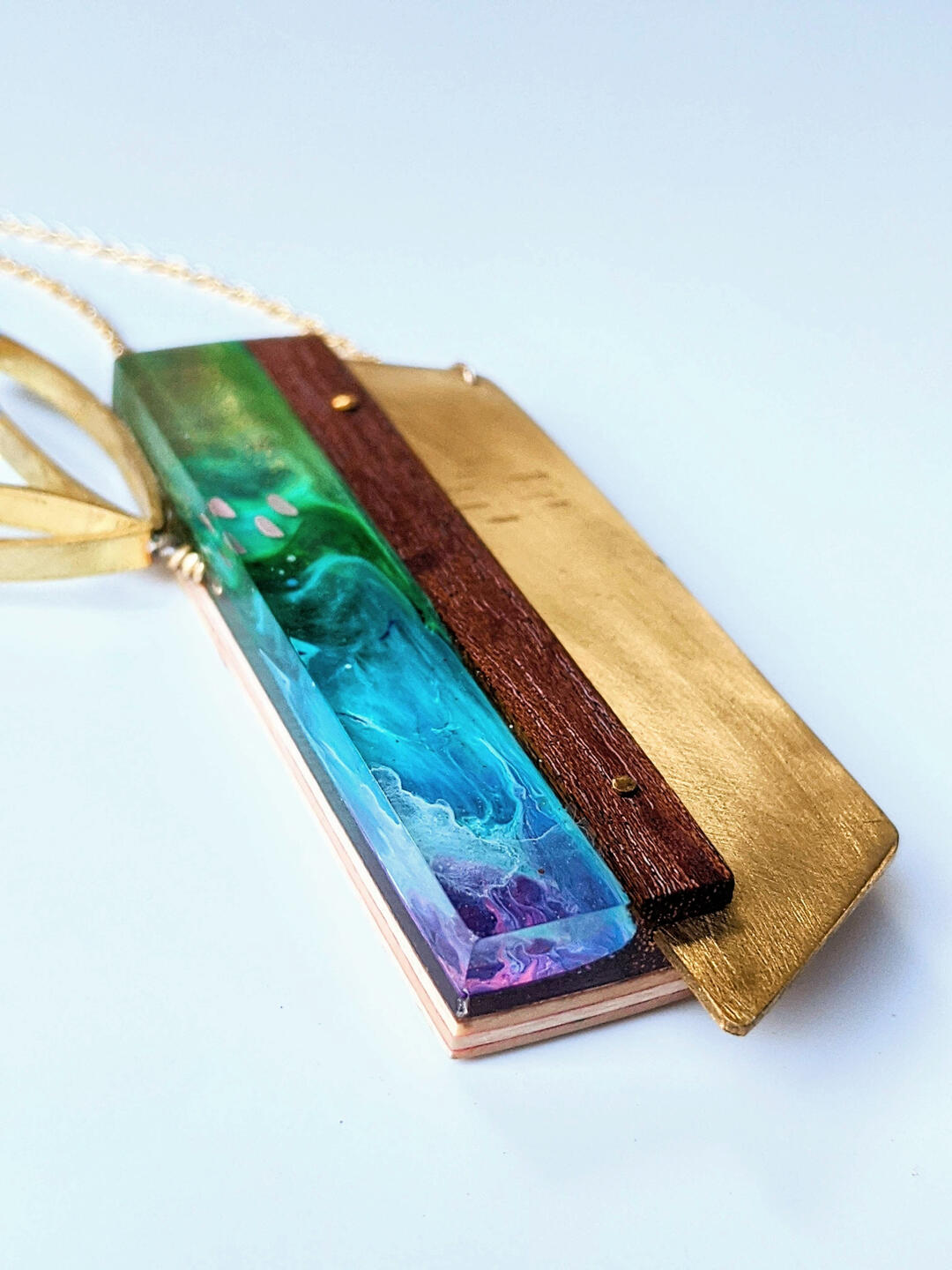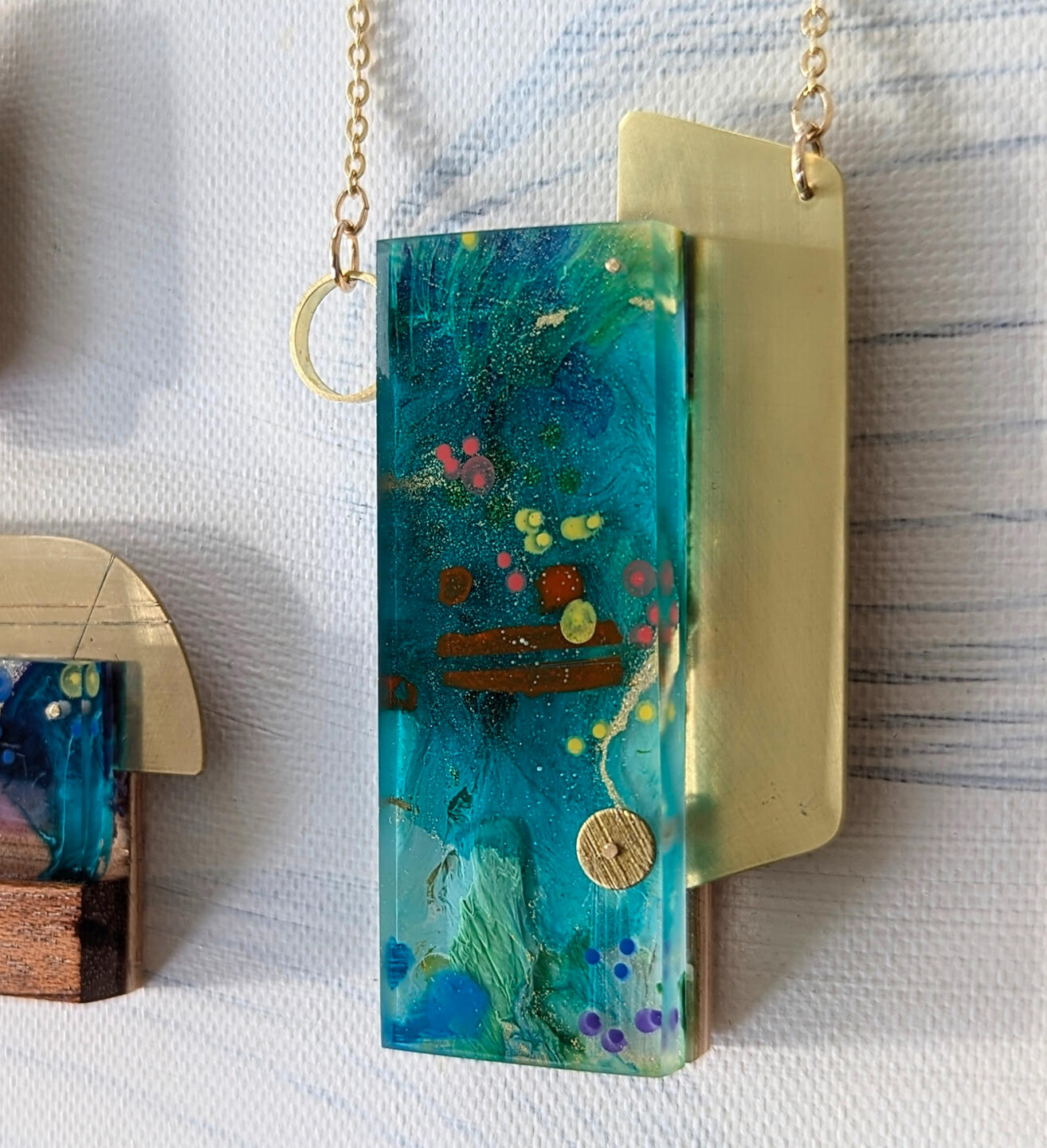 I use discarded wooden boxes as a canvas where I pour many layers of resin, each one painted with acrylic and pastel mediums. Once the piece is finished, I find the most interesting areas which are then cut, sanded, polished, and made into wearable art pieces by adding metal elements and stringing them from sterling silver or gold-filled chain.