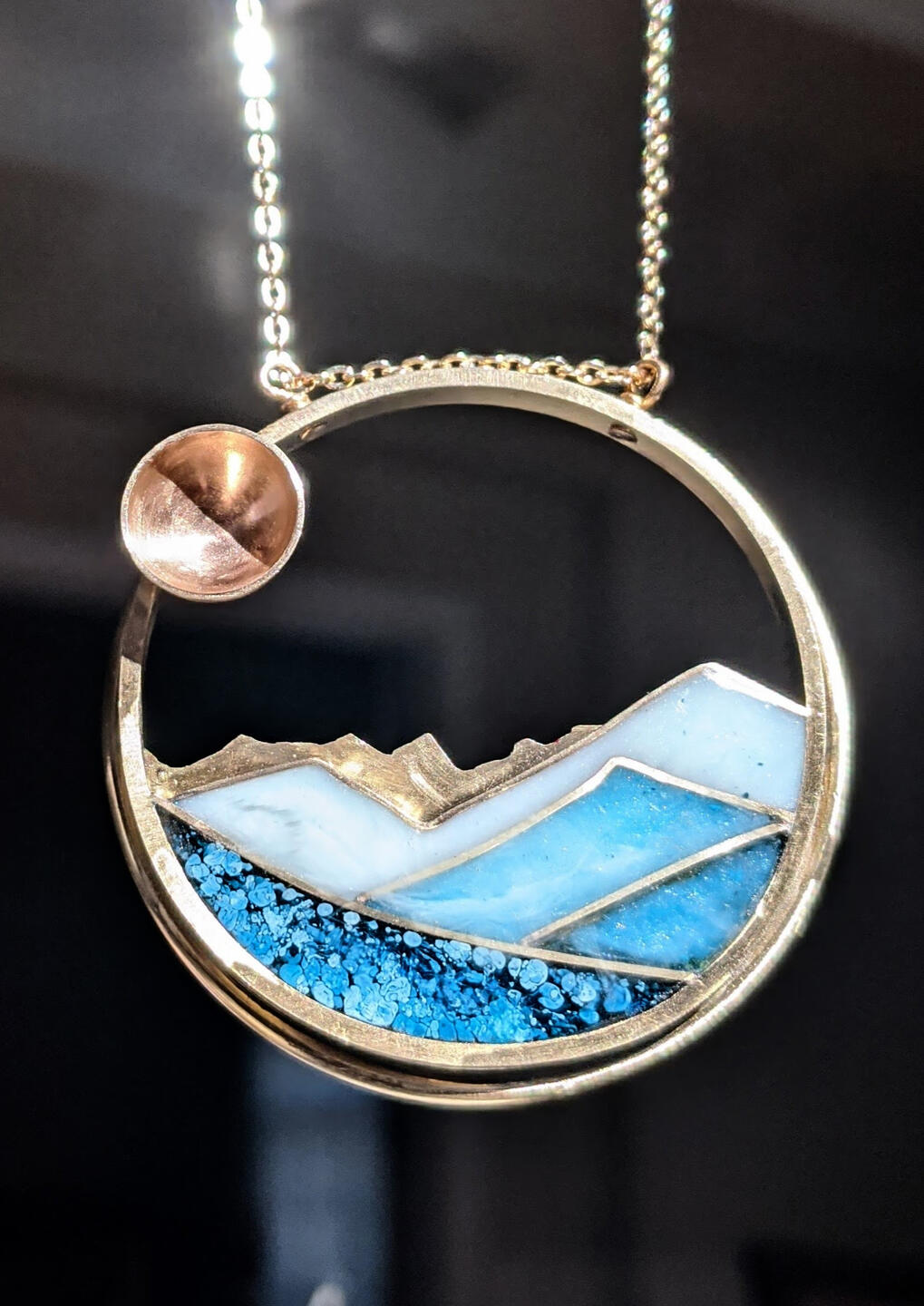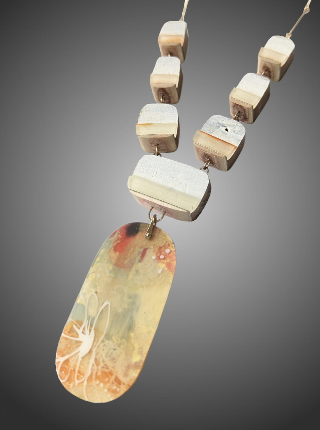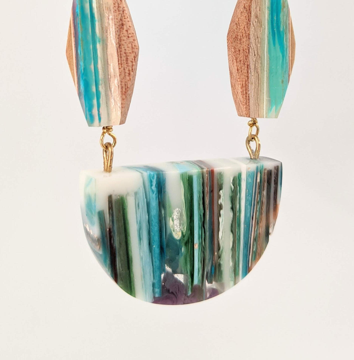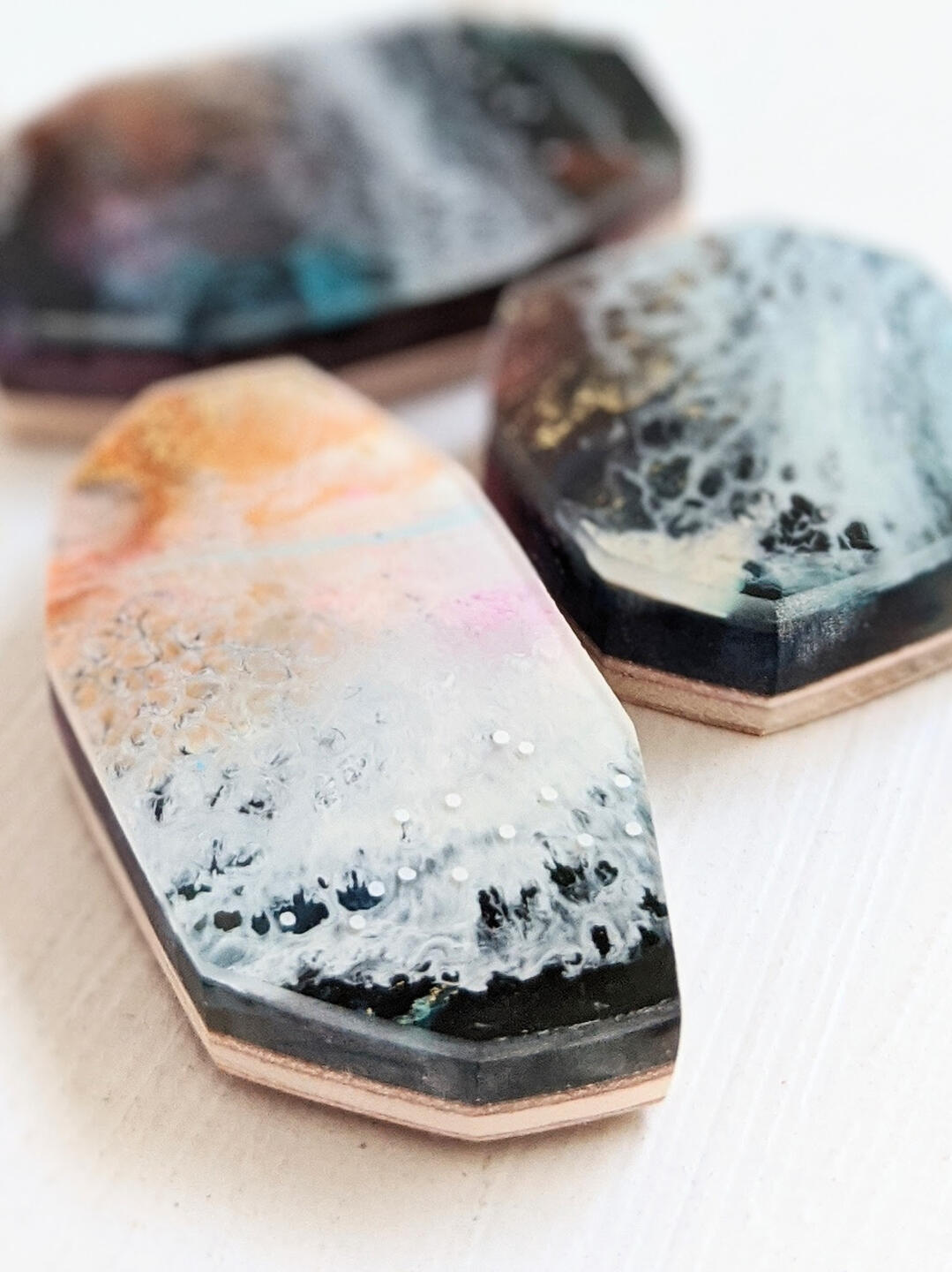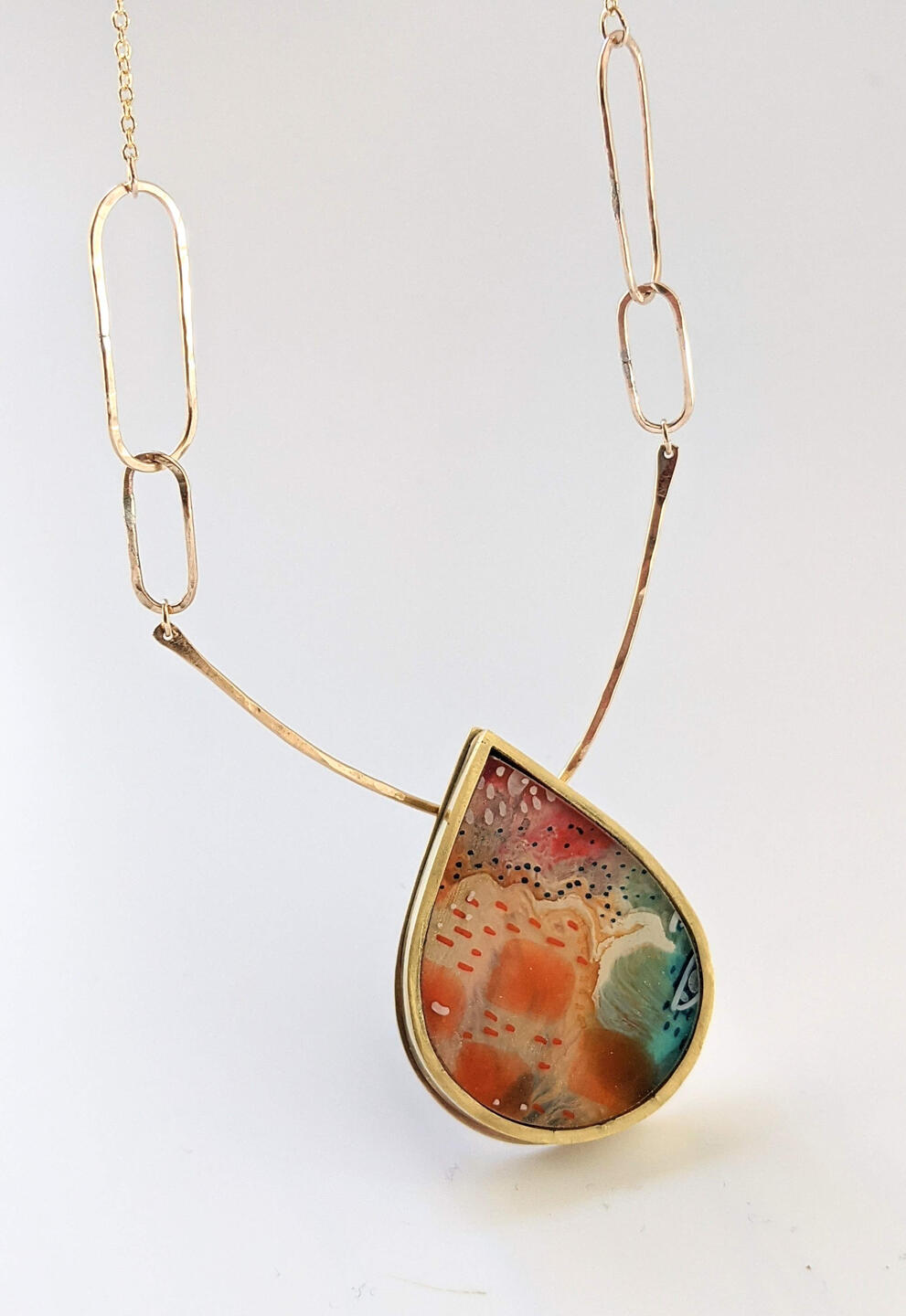 I use discarded wooden boxes as a canvas where I pour many layers of resin, each one painted with acrylic and pastel mediums. Once the piece is finished, I find the most interesting areas which are then cut, sanded, polished, and made into wearable art pieces by adding metal elements and stringing them from sterling silver or gold-filled chain.